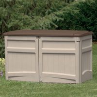 Horizontal garden storage shed. Offers two door front panel and lifting top lid for easy access. Great for storing cushions, garden accessories, recycling bins. Large panels allow fast snap-together assembly. Long lasting resin construction. Made for outdoors. Resistant to sun, cold and outdoor conditions. External Size: 4' 6" W × 2' 2" D × 2' 10" H. Internal Size: 4' 2" W × 1' 10" D × 2' 6" H. Color: Taupe with bronze top and accents.