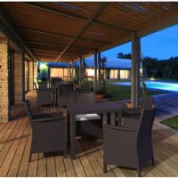 California Wickerlook resin dining set with four dining arm chairs and one 31 inch square dining table. Unlike any other woven furniture in the market Wickerlook furniture will never unravel. Chairs have no metal parts to rust, no moving parts that can break. Made for commercial durability. Perfect for home use or hotels and restaurants. UV treated. Hose down for cleaning. Withstands outdoor temperatures summer and winter. Chairs are 23 lbs and great for balcony use or in windy areas. Table doesn't have an umbrella hole. Chairs certified for strict European standards by CATAS Italian research institute and test laboratory. 100% acrylic natural cushions included.