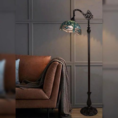 Elevate your interior decor with this exquisite floor lamp adorned with a stunning Tiffany glass dragonfly design shade in vivid green tones. Its intricate detailing and iridescent glass bring a touch of nature's beauty into your living space, creating a captivating and inviting atmosphere. This floor lamp combines both form and function, making it a perfect addition for those seeking a harmonious blend of artistry and illumination in their home.