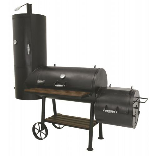 Black steel charcoal smoker grill with fire box and vertical smoker. This vertical smoker has 3 racks. It is made with heavy 10-Gauge steel. This grill has a surface of 36 by 18 inches. It has an all welded construction. It also has a 1200 F. high temperature point. It is made up of 304 stainless steel with cooking grates included. Its shelves and steel slats are made of polystyrene faux wood treated with UV and anti-oxidant protection. It is perfect old school smoker grill. It has a classic design.