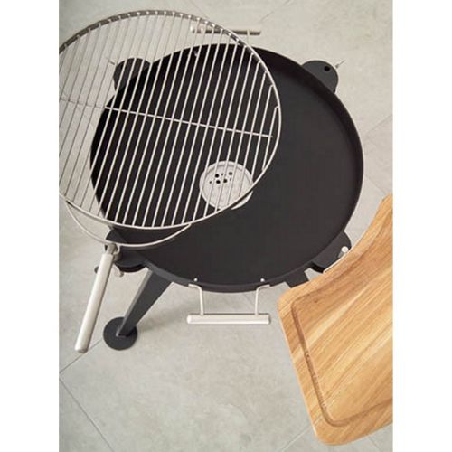 Charcoal deck grill from Hotspot. 24 inches in diameter heavy firebowl. Can be used as a fire pit as well. Spun iron construction and stainless steel grill and fittings. Swing out cooking grill for easy reloading. Large wood chopping board and steel hooks for tools. Great for patio and deck areas. 32 inches high leg structure keeps heat away from your deck.