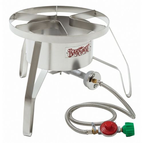 Outdoor patio gas stove HP cooker 14 inches. It has a large 14 inch square cooking surface, and can accommodate any size stockpot. It has an all welded stainless steel frame, and a 10-PSI hose/regulator/valve assembly. It also has a 13 inch high heavy duty stainless steel frame. This outdoor gas stove has a 6 inch cast iron fry burner. It comes with a 36" braided hose.