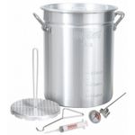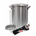 Comes complete with a seasoning injector, 12" stainless deep fry thermometer, vented lid for steaming and preventing vapor lock when boiling, plus sturdy, spot-welded handles for secure handling. Fryer can also be used to boil shrimp, corn, vegetables, and make large batches of soups and stews. Upper side indentation on cookware supports and elevates the stainless steel accessory basket from the bottom of the pot for steaming. Specifically designed for frying a whole turkey in as little as 45 minutes, this stainless steel Bayou Classic Turkey Fryer features a tall, narrow patented design that requires less cooking oil than a standard stockpot.