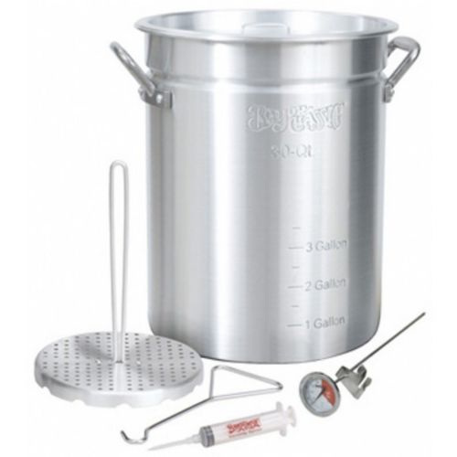Made of 99% pure aluminum, this 30-qt Turkey Fryer features heavy duty riveted handles and a vented lid. Inside the pot is a patented Poultry Rack and Lift Hook designed to create a circular flow of oil up through and around the cavity during the frying process. The final result is cooking your Thanksgiving Turkey golden brown. The select-grain leather glove (right hand only) protects from hot oil as you lift the turkey, to slowly insert and later remove, from the pot. The stainless 12-in. fry thermometer enables you to monitor and maintain optimal frying temperature. The 2 oz. Seasoning Injector with stainless needle is ideal for infusing your favorite seasonings into the turkey prior to cooking. Use outdoors only with your favorite Bayou Classic® high pressure cooker.