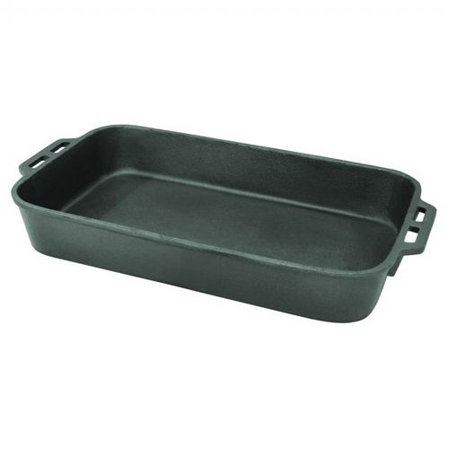 Cast iron 19.5 inch baking pan. The Bayou Classic cast iron pans feature durability, versatility, and overall quality. This cast iron cookware can accommodate any cooking need. It is made rough and rugged. These cast iron baking pans can be used in any oven or stove.