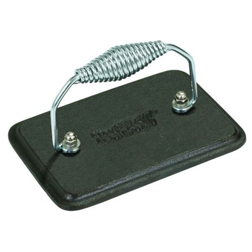 Cast iron bacon press. It has 8" Length × 5" Width. It features durability, versatility, and overall quality. It has a stay cool handle. This all cast iron cookware comes seasoned.