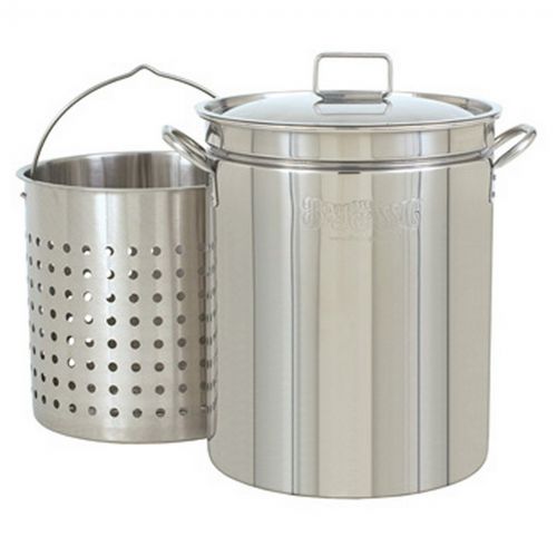Steam boil fry stockpot - 36 Qt stainless steel. These pots are made of 304 stainless steel. They are great for your indoor or outdoor chef, and they are one of the most versatile pots on the market. It is possible to use the basket to boil, steam, or fry all of your favorite foods, or remove it for those large helpings gumbo or stew. It is 13.5" diameter and 15" high. It has a 36 Qt capacity. It is made up of 20 gauge steel. It has a perforated steam/boil basket. It also has a vented lid. Its basket sits 3 inches above the bottom for steaming. The basket and the lid are included.