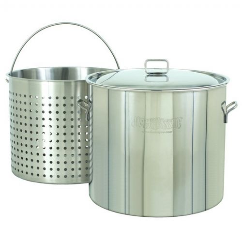 Steam boil fry stockpot - 82 Qt stainless steel. These pots are made of 304 stainless steel. They are great for your indoor or outdoor chef, and they are one of the most versatile pots on the market. It is possible to use the basket to boil, steam, or fry all of your favorite foods, or remove it for those large helpings gumbo or stew. It is 18.75" diameter and 17 high. It has a 82 Qt capacity. It is made up of 20 gauge steel. It has a perforated steam/boil basket. It also has a vented lid. Its basket sits on the bottom. The basket and the lid are included.