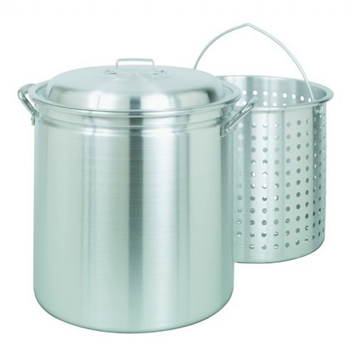 Steamer stockpot 42 Qt aluminum with lid and basket. This is a restaurant grade aluminum steamer stockpot from Bayou Classic. It has a 42 Qt. capacity. It includes vented lid and perforated boiling basket with holes. It is perfect for seafood, corn or vegetables. It is made up of 99% pure restaurant grade aluminum. Its stockpot measures: 15 inch in diameter with 15 ½ inch in height. It has a 16 gauge thickness. Its basket sets 3 ½ inches above the bottom for perfect steaming, boiling or frying.