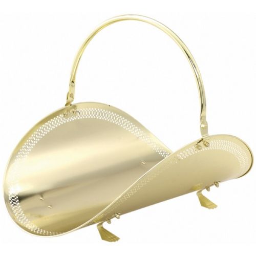 19" polished brass filigree wood basket. It has a polished brass finish and also has a basket style filigree with handle and is 19 inches high. It is a brighter shining wood basket that will enhance your fireplace like no other.
