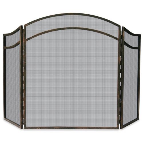 3 fold antique rust wrought iron arch top screen. It has an antique rust finish. It is 51.5 inches wide and has an Arch top design. It consists of 3 panels bringing a historic moment to your fireplace area.