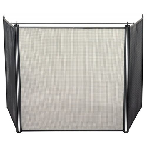 3 Fold over sized stove screen. It has a black finish and it is 81 inches wide. It has a simple and sleek design and it comes in 3 panels with support bar. It is a basic solution to prevent a fireplace safe from fire.