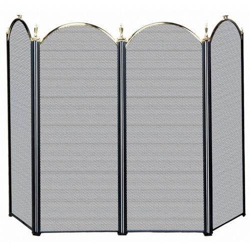 4 Fold polished brass / black screen (S-3117). It has a polished brass and black finish. It is 52 inches wide and it has a simple and sleek design. It comes in 4 panels that will enhance any fireplace area along with its fire prevention purpose.