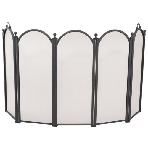 5 Fold black large diameter black screen. It has a black finish and is 67 inches wide. It also has a simple and sleek design and comes in5 panels. It is a perfect basic screen protecting any fireplace from spreading sparks. This screen comes in 5 panels.