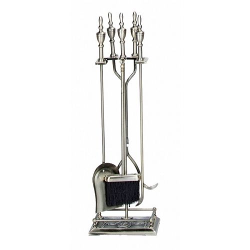 5 Piece antique brass fFire set (F-4206). It has a triple plated antique brass finish and it is 32 inches high. It includes includes stand, poker, shovel, brush and log lifter and it comes in with urn handles. It is a useful set of tools to keep the fire burning in any fireplace.