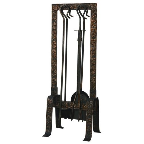 5 Piece antique copper patine embossed fireset. It is 5 pieces of useful tools to make fire on any fire place. It covers less space with its compact features. It especially has matching designs that fits antique copper patine embossed screens. Its shape and size fits any fire place and it is durable. It includes stand, poker, shovel, brush and log lifter.