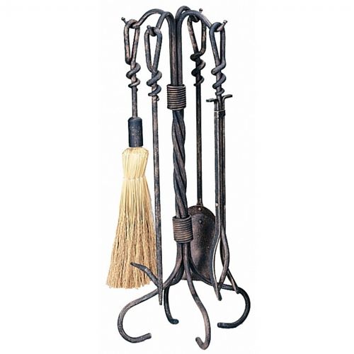 5 Piece antique rust wrought iron tool set. It has an antique rust finish. It is 30 inches high and it includes stand, poker, shovel, brush and log lifter. It has loop / twist handles which enhances any fireplace area.
