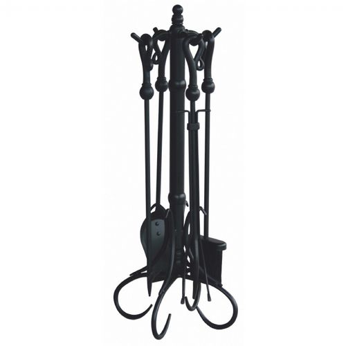 5 Piece black fire set with heavy crook handles. It is made up of black wrought iron and it is 30 inches high. It includes stand, poker, shovel, brush and log lifter and it has classic crook handles. It is a fire set that fits any fireplace area perfectly.
