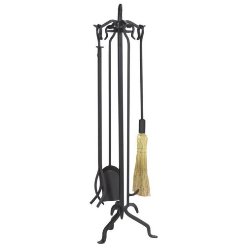 5 Piece black wrought iron extra tall fire set. It is made up of black wrought iron and it is 44 inches high. It includes stand, poker, shovel, brush and log lifter and it comes with classic crook handles. It is a different approach to fire sets, this one is made tall for its purpose.