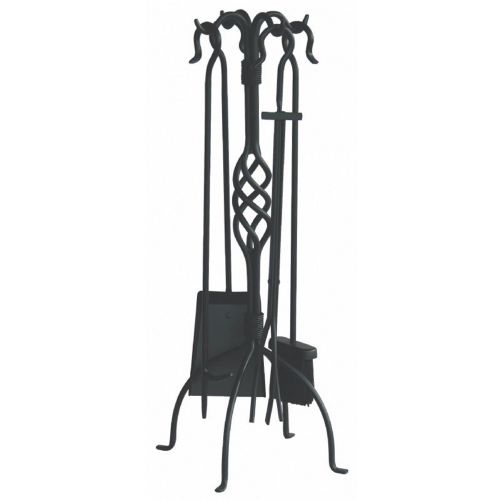 5 Piece black wrought iron fire set with center weave. It is made up of black wrought iron and it is 28 inches high. It includes stand, poker, shovel, brush and log lifter and it comes with crook handles.