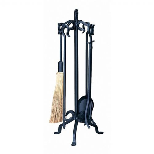 5 Piece heavy weight black w. i. fire set. It is made up of black wrought iron and it is 32 inches high. It includes stand, poker, shovel, brush and log lifter. It has classic crook handles. It is a nice fire set from the black wrought iron collection.