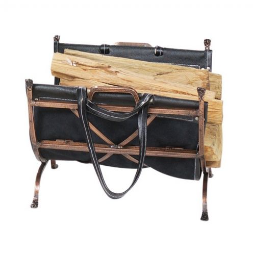 Antique copper wrought iron log holder with black leather carrier. It has an antique copper finish. It includes black leather carrier. It is 14 inches high and 22 inches wide. It is a compact log holder that covers less space and enhances any fire place.
