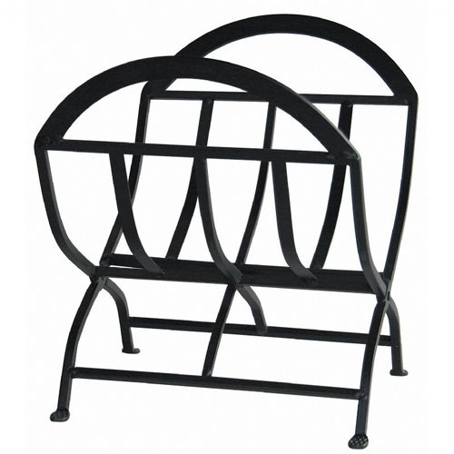 Black wrought iron log rack. It is made up of black wrought iron and has a bar design. It is 15 inches high and 22 inches wide. Its simple and sleek design serves its purpose perfectly.