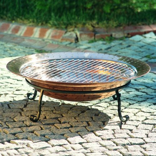 Small sized 24" copper outdoor fire pit. Made of 100% recycled copper. Fire pits have a melting point of 1700 F. Outdoor fireplace lets you enjoy crackling outdoor fire in your own backyard. Turn cool evenings into warm memories with these high quality copper fire pits. Outdoor fireplace is usable with wood, charcoal or artificial wood like Dura-flame log. Hand made from high quality copper by artisan coppersmiths. Will develop a soothing patina coloring once weathered. Fire pit has wrought iron legs for stability. Can be used as an ice tub for parties. Charcoal grate and wrought iron legs included.