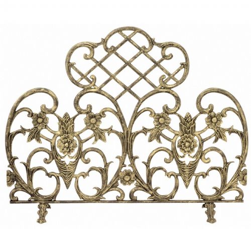 Single panel antique gold cast aluminum screen. It is made of antique cast gold aluminum and it is 42 inches wide. It has decorative leaf and scroll design. It consists of a single panel and is a durable product that prevent any fireplace area safe from fire.