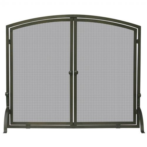 Single panel bronze finish screen with doors. It ha s a bronze finish and it is 39 inches wide. It has a simple and sleek design with doors opening on each side. It provides a very fire secure environment at a fireplace area.