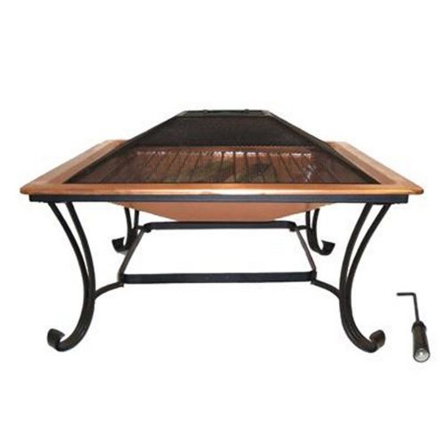 33" Square copper fire pit set. Heavy gauge copper fire bowl. Contemporary square design. Fire pit has a steel frame with beautiful wrought iron finish. Includes a removable spark screen to contain flying embers. Heavy gauge log grate allows for proper wood burning airflow. Includes: screen, lifting tool, log grate, and cover. Dimensions: 33"W × 33"L x19"H.