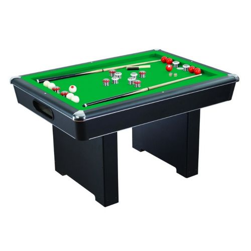 The Renegade slate bumper pool table offers outstanding durability and value to any family. Comes with a genuine slate playing surface for solid & true play. Quality Carmelli™ features include "CARB" certified MDF construction & steel corner posts with a chrome plated finish. The sturdy black cabinet includes rugged pedestal base legs with levelers for stable game play. A carpeted ball return system makes game setup quick & easy. The table includes two 48" cues, 10 bumper pool balls, a table brush & chalk.