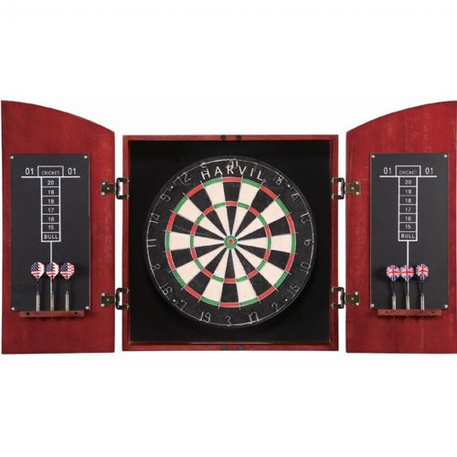 Everything you need to play a high stakes game of darts is packed into this beautiful Deluxe Solid Wood Dartboard Cabinet Set. This high-quality cabinet is made of North American yellow poplar hardwood, and stained with a beautiful dark cherry finish. The cabinet features two pub style chalk scoreboards for playing cricket and 01, two sets of darts with British and American flights, and a regulation dartboard with a removable number ring. This handsomely finished cabinet stores and protects your dartboard while protecting your back wall from stray darts during games, and adds a touch of elegance to your game room.