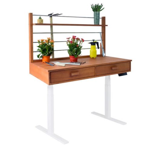 The perfect place to put all your gardening and other tools, this potting bench offers wide range of heights from 55 to 82 inches, making it easy to find a comfortable position to work in-sitting or standing, and allows your little children to join the work too! Smooth, fast transitions at the touch of a button with advanced Noise Cancellation Engineering Dual Motor, this frame supports up to 220 lbs of weight, making it an ideal potting bench for your family working. The top shelf for tools and equipment frequently used with three hangars ready for any potting procedures. Dual drawers provide spacious storage for all garden tools.