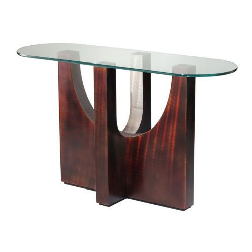 Clutch console table. It is an accent furniture by Nova Lighting. It is made of wood and aluminum and it has a rootbeer color. It has wooden legs and an oval glass top.