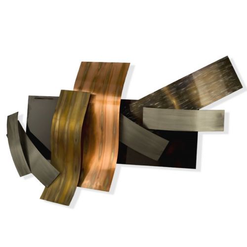 Collage wall art. It is a casual contemporary style wall art by Nova Lighting. It is made of steel and it has a ground steel, flame treated brass finish. It is a wall art made out of steel with soft curves and metallic colors.
