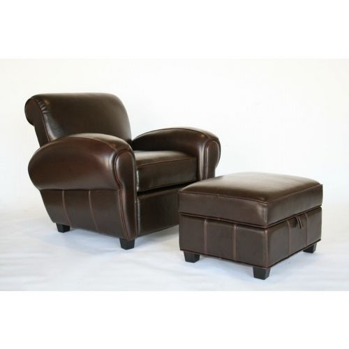 Club chair and ottoman lounge set. Crafted of a durable sustainable kiln-dried hardwood frame. Full bi-cast leather upholstery in dark brown for everything that touches your body. Fine PU is used on the sides and back for added durability, and easier cleanup. Thick padding on the head-rest and seat cushion provides exceptional comfort. Both Chair and Ottoman features Black hardwood legs.