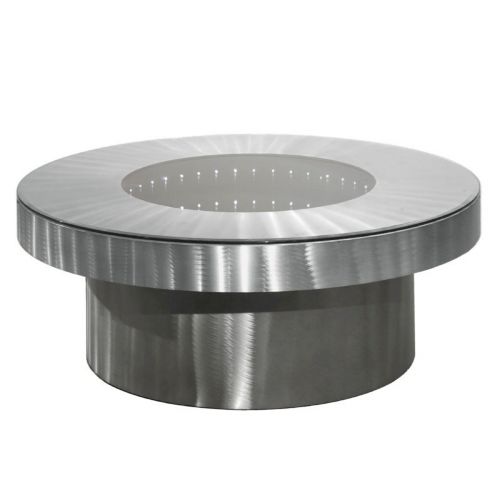 Infinity tunnel cocktail table battery operated. It is a modern style accent furniture by Nova Lighting. It is made of wood, metal and glass. It has a brushed aluminum finish. It operates with LED type bulbs of 3 watts that are not included. It comes with an on/off type of switch that is located on the body. This table is illuminated and it operates on batteries.