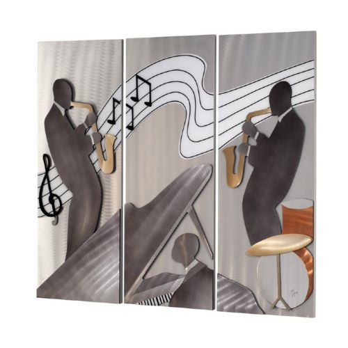 Jazz 3 piece wall graphic. It is a casual contemporary style wall art by Nova Lighting. It is made of wood and aluminum. It has a brushed aluminum finish along with charcoal, rust, white and black colors. This is a wall graphic art with jazz music serving as its theme.