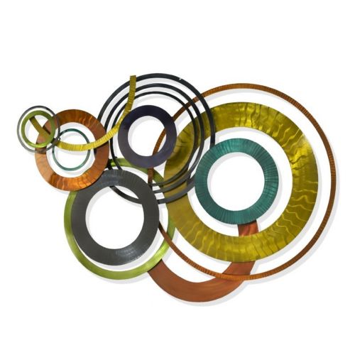 Kindred wall art. It is a casual contemporary style wall art by Nova Lighting. It is made of steel and it has multiple colors. This is a wall art with circles running through each other as if they were creating a vortex.