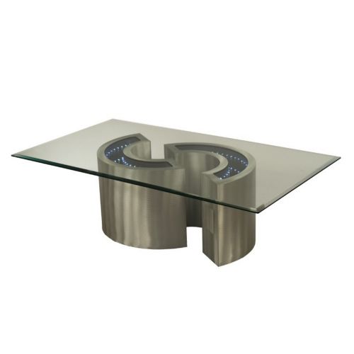 Magneto infinity cocktail table. It is a casual contemporary style accent furniture by Nova Lighting. It is made of wood, metal and glass. It has a brushed aluminum finish. It operates with LED type bulbs of 2 watts that are included as main. It comes with an on/off switch that is located on the body. This product is illuminated and operates on batteries.