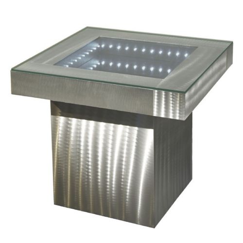 Square infinity end table. It is a modern style accent furniture by Nova Lighting. It is made of wood and aluminum. It has a brushed aluminum finish. It has an on/off type of switch. This table is illuminated and it does not operate on batteries.