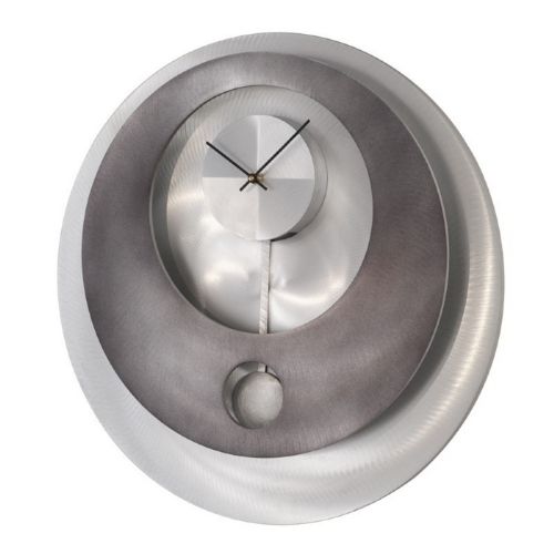 Vendome pendulum wall clock. It is a modern style clock by Nova Lighting. It is made of wood and metal. It has a gunmetal and brushed aluminum finish. This is a pendulum clock that has a sparky and flashy shell shaped frames that are placed within each other shaping its frame.