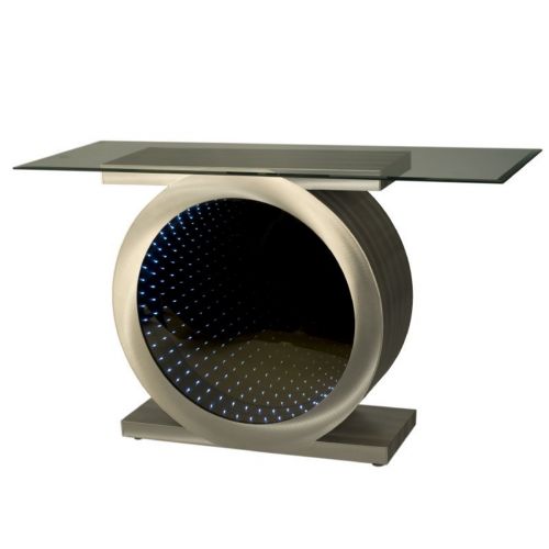 Vortex Infinity Console Table (Large). Vortex infinity console table. It is a modern style accent furniture by Nova Lighting. It is made of wood, metal, glass and mirror. It has an aluminum finish. It operates with LED type bulbs of 3 watts that are not included. It comes with a step type of switch that is located on the inline/cord. This console table is illuminated and does not operate on batteries.