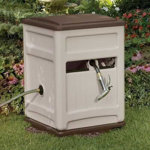Swivel Hose Hideaway Hose Reel with Smart Trak Hose Guide and Bin. Accepts 225 feet of ⅝ inch hose. Base swivels any direction. Stakes included. Smart Trak™ hose guide tracks hose neatly onto reel. Easy reeling with half the effort. Sturdy resin construction. Patented Easy-Link® system ensures a watertight connection between hose reel and hose. Large storage bin provides place to store accessories. Comes fully assembled. Dimensions: 26" W × 21" D × 29 ¾" H. Color Taupe with bronze accents.