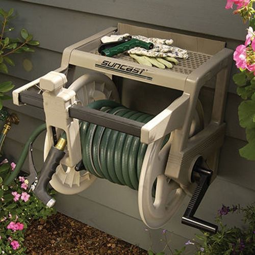 Wall mounted hose reel is a practical hose handler that can be mounted on walls. Holds up to 225 feet of ⅝ inch hose. Easylink® system ensures watertight connection between hose reel and hose. Mounts securely to walls. Slide-Trak™ hose guide makes winding and unwinding hose easier. Comes with a storage tray for holding gardening accessories. Assembly required. Dimensions: 21" W × 19" D × 19" H. Color Taupe.