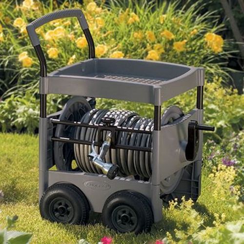 Industrial hose reel cart with tray and hose guide. Holds up to 300 feet of 5/8inch hose. Steel core construction. Features the strength of steel; the durability of resin. Storage tray for watering accessories. Slide-Trak hose guide makes winding easier. Strong crank for easy winding. Pneumatic tires for all terrain portability. Dimensions: 24 ½" W × 28 ½" D × 36" H. Color: Gray.