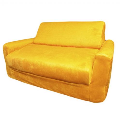 The Sofa Sleeper in canary yellow micro suede is a great seat for movie time, reading, and playing games, and it offers enough space to share with a friend. Flip it open for nap time, or use it as a spare bed during sleep overs. The removable cover is washable, and a layer of fiber is included on the seating surfaces to keep the fabric tight for a long time. This sofa is meant to withstand lots of use from kids.
