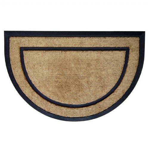 Half Round Coir Doormat with black rubber frame measures 24" × 36". Made from tufted coir fibers in a molded Rubber Mats. Designs are molded in rubber. These striking, durable mats have thousands of coir bristles embedded in a rubber base that help capture and remove dirt and moisture from shoes. The heavy duty non skid rubber backing keeps the coir from shedding and keeps mat in place. These mats bravely stand up to any amount of foot traffic. Rubber coir mats are made from renewable and natural materials, which are environment friendly. Some color transfer may occur onto natural stone, concrete or other surfaces when the mats are excessively exposed to the elements. Slight variations in size and texture are natural and add a special character to the mat.