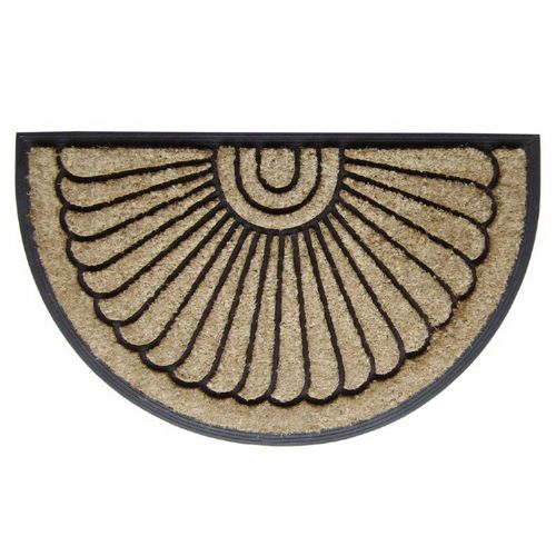 Sunburst half round coir doormat with rubber base measures 18" × 30". Made from tufted coir fibers in a molded rubber mats. Designs are molded in rubber. These striking, durable mats have thousands of coir bristles embedded in a rubber base that help capture and remove dirt and moisture from shoes. The heavy duty non skid rubber backing keeps the coir from shedding and keeps mat in place. These mats bravely stand up to any amount of foot traffic. Rubber coir mats are made from renewable and natural materials, which are environment friendly. Some color transfer may occur onto natural stone, concrete or other surfaces when the mats are excessively exposed to the elements. Slight variations in size and texture are natural and add a special character to the mat.